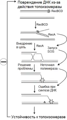 RecA запускает расщепление не только LexA, но также белка UmuD, который благодаря этому активируется, и вместе с ним активируется система репарации, склонной к ошибкам. Согласно наиболее распространённой модели, комплекс UmuD2UmuC связывается с RecA вблизи места повреждения. Далее RecA разрезает UmuD с образованием UmuD', что активирует комплекс, и после этого комплекс UmuD'2UmuC, известный как ДНК-полимераза V, синтезирует фрагмент ДНК поверх повреждённого участка, допуская при этом существенно больше ошибок, чем обычные ДНК-полимеразы[6].