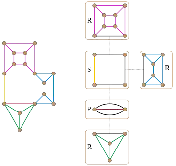 - Помечаем каждую компоненту разбиения буквой P (двухвершинная компонента с кратными рёбрами), буквой S (компонента в виде треугольника) или R (любая другая компонента). Пока имеются две компоненты, имеющие общую связанную пару виртуальных рёбер, и обе компоненты имеют тип S или обе компоненты имеют тип P, сливаем эти компоненты в одну бо́льшую компоненту того же типа.