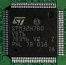 STM32 — семейство 32-битных микроконтроллеров производства STMicroelectronics. Чипы STM32 группируются в серии, в рамках каждой из которых используется одно и то же 32-битное ядро ARM, например, Cortex-M7F, Cortex-M4F, Cortex-M3, Cortex-M0+ или Cortex-M0. Каждый микроконтроллер состоит из ядра процессора, статической RAM-памяти, флеш-памяти, отладочного и различных периферийных интерфейсов.
