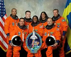 В экипаже «Дискавери» — пять новичков космических полётов: Уильям Офелейн, Николас Патрик, Джоан Хиггинботэм, Кристер Фуглесанг и Суннита Уильямс. Кристер Фуглесанг — первый астронавт Швеции.