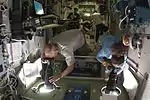 Астронавты Форман и Сэтчер подготавливали свои скафандры, оборудование и инструменты, которые понадобятся им во время первого выхода в открытый космос, запланированный на следующий день.
