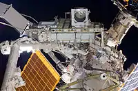 Три старых снятых с сегмента Р6 батареи закреплены в транспортной платформе, одна временно осталась на сегменте Р6. Её перенесут на платформу во время следующего выхода в открытый космос.