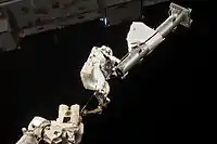 Астронавты направляются к транспортной тележке манипулятора, на которой вчера была установлена транспортная платформа с оборудованием, которое должно быть смонтирована на станции.