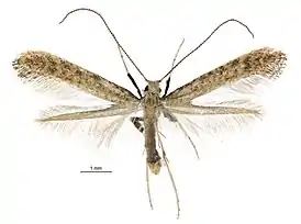 Размах крыльев около 10 мм. Основная окраска желтовато-чёрная. В переднем крыле 12 жилок. Яйцо откладывается самкой на листе растения-хозяина, обычно на нижней стороне рядом с средней жилкой. Гусеницы вначале минируют листья яснотковых кустарниковых растений Teucrium parvifolium (Lamiaceae), а затем поперечно сворачивают их в трубку[1].