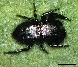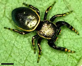 Паук-скакун Sassacus cyaneus напоминает жука-листоеда. Пример мимикрии.