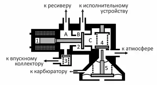 Как только водитель при включённом зажигании касался рычага коробки передач и сдвигал его в любом направлении на несколько миллиметров, срабатывал микровыключатель в его основании, который подавал напряжение на обмотку соленоида электромагнитного клапана (1). При этом шток клапана (2) выдвигался из соленоида и открывал канал между вакуумной полостью A и промежуточной полостью B, одновременно перекрывая канал, соединяющий промежуточную полость с атмосферной C. При этом в промежуточной полости возникало разрежение, которое также передавалось в полость исполнительного устройства. Исполнительное устройство срабатывало, выключая второе сцепление, после чего водитель мог включить нужную передачу или нейтраль.