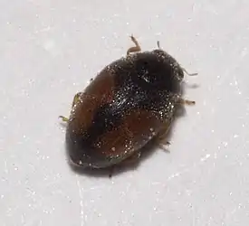 Жук длиной 1,3—1,8 мм. Надкрылья чёрные, с одним большим и длинным красно-жёлтым пятном, лежащим посередине надкрылий[1].