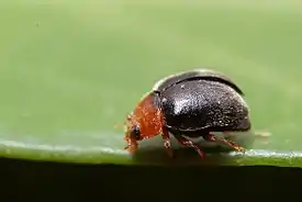 Жук длиной 1,8—2 мм. Надкрылья чёрные, ноги рыжие, самки с жёлтой верхней губой. у самцов переднеспинка жёлтая с чёрным пятном[1].