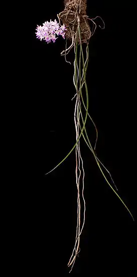 Стебель прямой, до 25 см в длину, моноподиального типа. Корни длинные, часто длиннее и многочисленнее листьев.