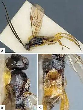 Мелкие паразитические наездники (около 3 мм). От близких родов отличается апикально сильно суженным первым тергитом, полностью гладким; второй тергит субтреугольный; II-й и III-й тергиты гладкие и блестящие. Проподеум гладкий. Жгутик усика 16-члениковый. Нижнечелюстные щупики 5-члениковые, нижнегубные щупики состоят из 3 сегментов. Дыхальца первого брюшного тергиты находятся на латеротергитах. Паразитируют предположительно на гусеницах бабочек[1][2].