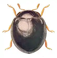 Жуки мелких размеров; длина — 1,60—2,08 мм, ширина — 1,40—1,98, высота — 0,82—1,02 мм. Окраска, в основном, чёрная, кроме желтовато-коричневых головы, передних углов пронотума и ног. Тело полушаровидной формы, сильно выпуклое, блестящее, покрыто очень редкими волосками. Голова подогнута, ротовые органы направлены в низ и чуть назад[2].