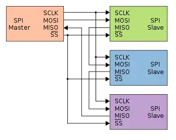 Первый способ позволяет реализовать радиальную структуру связи (топология типа «звезда»), его принято считать основным способом подключения нескольких ведомых устройств. В данном случае для обмена более чем с одним ведомым устройством ведущее устройство должно формировать соответствующее количество сигналов выбора ведомого устройства (SS). При обмене данными с ведомым устройством, соответствующий ему сигнал SS переводится в активное (низкое) состояние, при этом все остальные сигналы SS находятся в неактивном (высоком) состоянии. Выводы данных MISO ведомых устройств соединены параллельно, при этом они находятся в неактивном состоянии, а перед началом обмена один из выходов (выбранного ведомого устройства) переходит в активный режим.