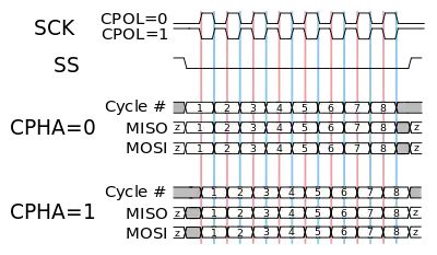Возможны четыре режима синхронизации. Режим определяется комбинацией бит CPHA и CPOL: