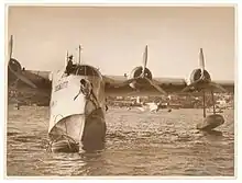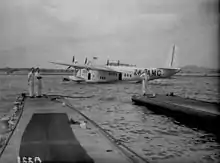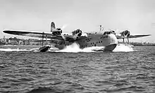 ![]() Летающая лодка Short Empire S.30, G-AFKZ «Cathay» (рус. Катай) авиакомпании British Overseas Airways Corporation, взлетает с дамбы Ваал, южноафриканского морского терминала и перевалочного пункта BOAC. | |