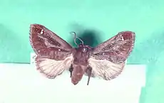 Имаго — тёмно-коричневая моль. Гусеница зелёная, по обоим концам тела коричневая, в центре имеется коричневое пятно с белой окантовкой, напоминающее седло. Длина тела 2,5—3 см. С обоих концов тела у гусеницы пара мясистых отростков—«рожек» с волосками-жалами, содержащими яд. Укол может быть болезненным и вызвать отёк, тошноту, сыпь, которые держатся несколько дней.