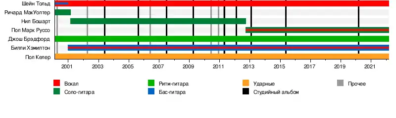 ![]() Выступление группы в 2016 году. Слева-направо; басист Билл Хэмилтон, гитарист Джош Бредфорд, барабанщик Пол Кёлер, вокалист Шейн Тольд, гитарист Пол Марк Руссо | |
