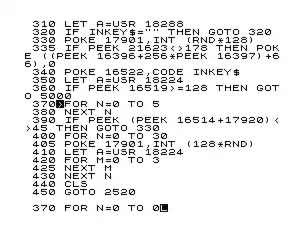 Большая верхняя часть экрана содержит код текущей загруженной программы, 3D Monster Maze. Текущая выбранная строка помечена «программным указателем», инвертированным символом знака 'больше'. Нижняя часть экрана содержит текущую версию редактируемой строки, находящейся в буфере строчного редактора. Текущая позиция ввода помечена инвертированной буквой, обозначающей режим ввода, буква 'L' обозначает режим обычного ввода букв. Пользователь изменил количество итераций в цикле задержки, чтобы повысить скорость игры. Нажатие клавиши ввода подтвердит внесение изменений.