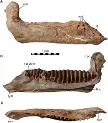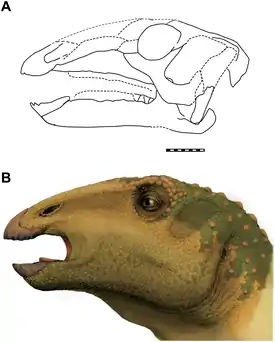 Голотип представляет собой сочленённую мозговую коробку, состоящую из верхней затылочной кости, боковых затылочных костей, заднеушных костей, переднеушных костей, теменных костей, лобных костей, основной затылочной кости, основной клиновидной кости, глазнично-клиновидных костей, парасфеноида и боковых клиновидных костей, а также заглазничные и чешуйчатые кости.