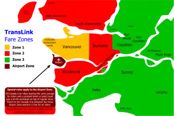 Вся сеть SkyTrain разделена на три географических зоны, а сумма оплаты проезда зависит от того, сколько границ между зонами пересечёт пассажир за время своей одной поездки (причём поездки после 18:30, на выходные и в праздники приравниваются к поездкам внутри одной зоны независимо от того, сколько зон было посещено на самом деле). Кроме того, при путешествии с одной из трёх станций дополнительной зоны «Аэропорт», располагающейся на острове Морском, взимается дополнительная плата.