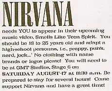 «Smells Like Teen Spirit» была выпущена 10 сентября 1991 года в качестве дебютного сингла Nevermind[комм. 3], став первым релизом группы на лейбле DGC Records. Первоначально песня не попала в чарты, кроме того, она имела хорошие показатели лишь в тех регионах США, где уже сформировались фанбазы коллектива[46]. Никто не прогнозировал, что «Smells Like Teen Spirit» станет хитом, поскольку в первую очередь её задачей было привлечение фанатов альтернативного рока. Предполагалось, что следующий сингл, «Come as You Are», может стать более интересной композицией для мейнстримовой аудитории. Тем не менее, колледж-радио и современные рок-радиостанции обратили внимание на композицию, обеспечив ей высокую ротацию в эфире. По словам менеджера Nirvana Дэнни Голдберга, «никто из нас не рассматривал её как песню-кроссовер, но её мгновенно разглядела публика… Они услышали её по альтернативному радио, а затем они бросились раскупать её словно лемминги»[47]. Мировая премьера видеоклипа сингла состоялась в ночной альтернативной рок-программе MTV «120 минут», музыкальное видео оказалось настолько популярным, что вскоре телеканал начал регулярно транслировать его ещё и в дневном эфире[31]. В октябре руководство MTV включило видео в список «Buzz Bin»[комм. 4], где оно продержалось до декабря. К концу года песня, её видеоклип и альбом Nevermind превратились в хиты. Как песня, так и Nevermind стали редким феноменом медийного кросс-формата, став популярными на всех ведущих рок-радио-направлениях, включая современный рок, хард-рок, альбомный рок и колледж-радио[48].
