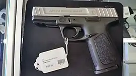 Питание патронами SD9 и SD40 осуществляется из коробчатого двухрядного магазина с выходом патронов в один ряд. После опустошения магазина затвор-кожух блокируется затворной задержкой (её рычаг с левой стороны рамы) в крайнем заднем положении. Фиксатор ствола — двухсторонний над спусковой скобой, защёлка магазина — в основании спусковой скобы. Прицельные приспособления — мушка и целик в пазах затвора-кожуха типа «ласточкин хвост». Мушка имеет светящуюся в темноте тритиевую вставку, целик – две белые вставки.