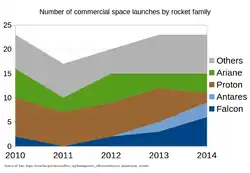 - Peter B. de Selding. Arianespace, SpaceX Battled to a Draw for 2014 Launch Contracts (англ.) (12 января 2015). Дата обращения: 20 сентября 2020. Архивировано 25 сентября 2020 года.