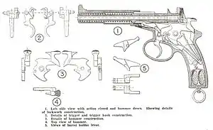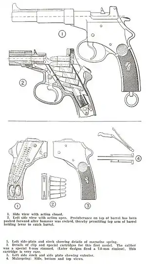 Для того, чтобы зарядить пистолет, надо нажать на спусковой крючок и оттянуть ствол за выступ спереди в крайнее переднее положение. При нажатии на спусковой крючок поворачивается ствольная задержка, которая удерживает ствол в переднем положении. Затем, чтобы зарядить 5 патронов с помощью обоймы или в одиночку, необходимо отпустить спусковой крючок, взвести курок и еще раз нажать на спусковой крючок для производства выстрела. После выстрела надо снова отпустить спусковой крючок, взвести курок и снова нажать на спусковой крючок. Процесс повторяется. В некоторых моделях пистолет имел УСМ двойного действия, но ни в одной модели цикл автоматики не включал автоматический взвод курка.