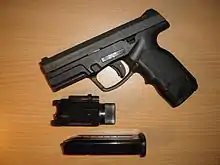 | Прицел | Штатные прицельные приспособления имеют необычную форму — мушка имеет треугольное сечение, а целик — трапециевидный вырез. Так как и мушка, и целик установлены на затворе в пазах типа «ласточкин хвост», возможна их замена на иные, в том числе и традиционные типы открытых прицелов. |