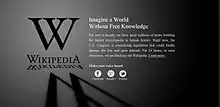 18 января 2012 г. в интернете состоялась акция протеста, в рамках которой множество популярных сайтов либо полностью «отключились», показывая вместо любой страницы сообщение об акции против SOPA, либо информировали своих посетителей об акции иным, менее радикальным образом. После длительной масштабной дискуссии среди участников англоязычного раздела Википедии, сообщество участников приняло решение поддержать акцию. Это решение получило поддержку руководства Фонд Викимедиа, в результате английский раздел Википедии также был «заблокирован» на 24 часа[23].