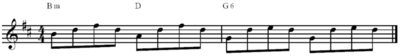 4 с темпом 103 удара в минуту[14]. Песня начинается с милитаристского барабанного боя и партии электроскрипки; причём, агрессивный ритм малого барабана очень схож с ритмом, используемым для поддержания марширующего военного оркестра. Характерный звук барабана был достигнут путём записи ударной установки Маллена у основания лестничного пролёта, создавая более естественную реверберацию. За ним следуют повторяющиеся арпеджио Эджа (см. нотную схему слева). Рифф, выстроенный на прогрессии Bm-D-G6, является своеобразным водоразделом перехода мелодии к минорным трезвучиям. По мере продвижения композиции слова, а также гитарное звучание становятся все более яростными. Впоследствии основной гитарный «Sunday Bloody Sunday» характеризовался редакцией Rolling Stone как «сокрушительный стадионный рифф десятилетия»[15]. Основой ритмического рисунка песни до первого припева служат удары по бас-барабану на каждом такте, после чего в мелодию вступает бас-гитара Адама Клейтона.