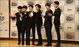 ![]() Super Junior-M на пресс-конференции шоу «Гостевой дом», июль 2014 года. Слева направо: Рёук, Сонмин, Донхэ, Ынхёк, Кюхён и Чжоу Ми | |