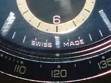 Словосочетание «Swiss Made» было формально принято в конце XIX столетия производителями швейцарских часов для защиты своей продукции от подделок[1]. По закону Швейцарии необходимо разрешение для использования гравировки «Suisse», «produit suisse», «fabriqué en Suisse», «qualité suisse» или их переводы, «Swiss», «Swiss Made» или «Swiss Movement». На более старых часах использовалась надпись «Swiss» на позиции 6 часов.