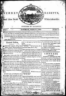![]() Первый номер Sydney Gazette and New South Wales Advertiser, 5 марта 1803 года. | |