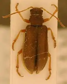 Жук длиной 5,4—7,5 мм. Тело удлинённое, опушенное, бурого цвета. Лапки и усики рыжего цвета. Самец темнее самки, часто полностью тёмно-бурый. Переднеспинка уже надкрылий, её боковые края с 3-4 острыми зубчиками и утолщенными передними углами.
