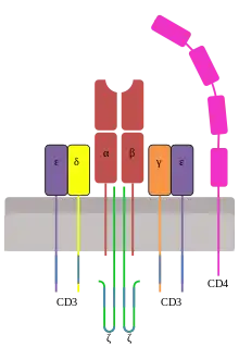 Т-клеточные рецепторы являются основными поверхностными белковыми комплексами Т-лимфоцитов, ответственными за распознавание процессированных антигенов, связанных с молекулами главного комплекса гистосовместимости (ГКГ, англ. major histocompatibility complex (MHC)) на поверхности антигенпредставляющих клеток[2]. Т-клеточный рецептор связан с другим полипептидным мембранным комплексом, CD3. В функции комплекса CD3 входит передача сигналов в клетку, а также стабилизация Т-клеточного рецептора на поверхности мембраны. Т-клеточный рецептор может ассоциироваться с другими поверхностными белками, его корецепторами. В зависимости от корецептора и выполняемых функций различают два основных типа Т-клеток.