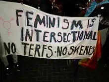 TERF (/ˈtɜːrf/, также пишется, как terf) — это сокращение словосочетания trans-exclusionary radical feminist (с англ. — «исключающая транс-людей радикальная феминистка»). Определение впервые было предложено в 2008 году для обозначения меньшинства феминисток, придерживающихся трансфобных взглядов, в частности отрицающих право транс-женщин называться женщинами[1][2][3], выступающих против посещения транс-женщинами только женских пространств (например женских туалетов) и в целом выступающих против прав транс-людей[4]. В академической среде предубеждения об опасности транс-женщин в женских пространствах считаются безосновательными.