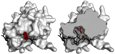 Специфичность обеспечивается большой площадью контакта между ферментом и субстратом. Протеазы, такие как трипсин, специфичны для одного аминокислотного остатка до и после расщепляемой связи за счет мелкой связывающей щели только с одним или двумя карманами, которые связывают боковые цепи субстрата. И наоборот, вирусные протеазы, такие как TEV-протеаза, имеют длинный C-концевой хвост, который полностью закрывает субстрат для создания связывающего тоннеля. Этот туннель содержит набор связывающих карманов, так что каждая боковая цепь пептидного субстрата (с Р6 до Р1’) связывается с комплиментарным сайтом (с С6 до С1’).[3]