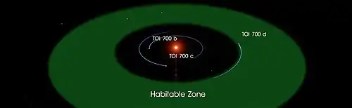 Телескоп TESS обнаружил транзитным методом, что три экзопланеты вращаются вокруг звезды TOI 700. Все три экзопланеты могут быть приливно захвачены[5][6]. Планета TOI-700 d является первой экзопланетой земной группы, находящейся в обитаемой зоне своей звезды, открытой на этом телескопе[7].