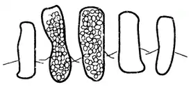 ![]() Аски и бластоспоры гриба (увеличение ~×800) | ||||||||||