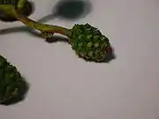 На серёжках появляются разросшиеся до 1—2, иногда до 6 см листовидные чешуйки красного цвета, затем чернеющие.