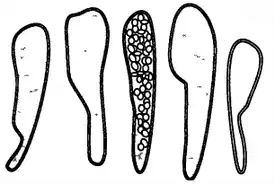 Аски восьмиспоровые, размерами 28—54×8—15 мкм, цилиндрические, удлинённые, с закруглённой верхушкой. В нижней части имеют узкие корневидные ножки, проникающие между клеток растения. Базальные клетки (см. в статье Тафрина) отсутствуют.