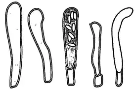 Аски размерами 30—45×6—8 мкм, цилиндрические или булавовидные, с округлыми верхушками. Базальные клетки (см. в статье Тафрина) 6—13×5—8 мкм, имеются не у всех асков.