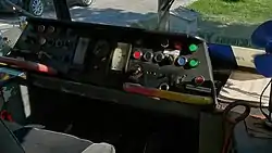 На главной панели водителя (пульте) размещены все важные элементы сигнализации и управления. На полу в кабине водителя находятся ножные элементы управления: ездовые и тормозные элементы управления и электромагнитное управление песочницами. В левом столике помещается отключение контактного провода — заземление и высоковольтные предохранители. В правой отделяющей стенке вагона находятся остальные элементы сигнализации и управления. Место водителя отапливается калорифером. Естественная вентиляция производится с помощью сдвижных окон (форточек), принудительную вентиляцию обеспечивает вентилятор калорифера (скорость воздушного потока 140 м³/час) и дополнительный вентилятор (скорость воздушного потока 500 м³/час) В задней части вагона для маневрирования трамваем без пассажиров предусмотрен вспомогательный переключатель управления вагоном, запираемый на ключ.