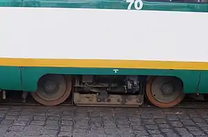 Ходовая часть вагона представляет собой две двухосные тележки, свободно вращающиеся вокруг шкворней, которыми они крепятся к кузову, что обеспечивает вагону хорошее вписывание в кривые и спокойный, плавный ход на прямых. Тележки вагона мостового типа, оси закрыты стальным кожухом, который одновременно является корпусом осевого редуктора. Два кожуха с продольными балками образуют конструкцию, эквивалентную раме обычной тележки, на которую через рессорное люлечное подвешивание опирается кузов. Колёса вагона составные, подрезиненные[23].
