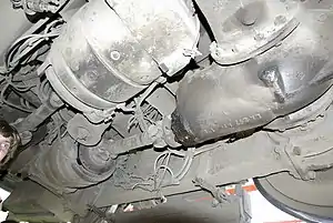Для аварийного торможения на каждой тележке вагона установлено по два магниторельсовых тормоза, питающихся током от аккумуляторной батареи (до 60 А при 24 В). Башмак магниторельсового тормоза состоит из его рабочей обмотки в металлическом защитном чехле и магнитной цепи (марка железа Ст. 20) с немагнитным зазором против головки рельса. Он подвешивается на высоте 12 мм над головкой рельса при помощи пружин и передаёт тормозное усилие продольным балкам тележки посредством мощных кронштейнов и тяги. Усилие прижатия каждого башмака к рельсу при подаче тока в катушку составляет эквивалент веса 5 тонн. Магниторельсовый тормоз включается при нажатии тормозной педали до упора или нажатии кнопки аварийного тормоза. До 1975 года штуцеры проводов, подводящих ток к катушке, были прямыми и при сходе с рельсов срезались, после 1975 года конструкция была изменена на коленчатую[35].