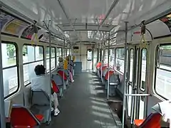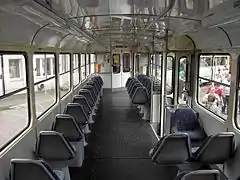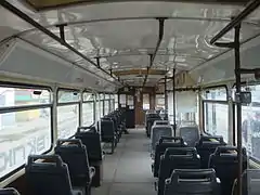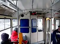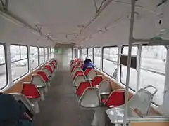 Салон трёхдверного вагона Tatra T3 компоновки 1+1, вид назад