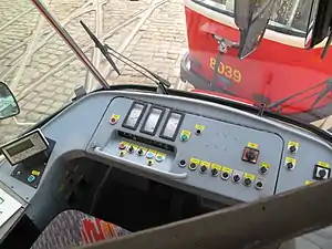 В кабине, отделённой от салона перегородкой с дверью и дымчатым стеклом, размещены основные органы управления вагоном: контроллер водителя с педальным приводом, пульт, шкаф с предохранителями справа, слева — реверсор, привод песочниц и шкаф с выключателями отопления и освещения. Сиденье водителя подрессорено, регулируется по высоте и углу наклона спинки, кабина отапливается калорифером[17] (4,8 кВт), который также обдувает тёплым воздухом стёкла, предупреждая их запотевание или обмерзание. Калорифер может включаться на полную либо половинную мощность и забирать воздух либо из кабины для рециркуляции, либо из-под вагона, если погода не слишком холодная. Калорифер имеет автоматический тепловой выключатель с дугогашением[18]. Без подогрева вентилятор калорифера используется для принудительной вентиляции кабины[17].