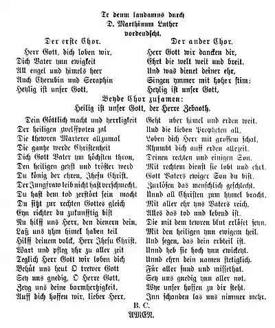 Гимн «Te Deum» также присутствует в богослужениях некоторых протестантских церквей (главным образом, англикан и лютеран). Мартин Лютер, в 1529 сочинивший собственный рифмованный перевод текста («Herr Gott, dich loben wir», см. иллюстрацию), ставил гимн чрезвычайно высоко, называл его «третьим Символом веры». Возможно, по этой причине ещё долгое время после Реформации в лютеранских церквах «Te Deum» распевали не только на лютеровский, но и на оригинальный латинский текст[16]. С XIX века широкое распространение получила немецкая обработка «Großer Gott, wir loben dich», сделанная в 1771 году католическим священником Игнацем Францем. Русский перевод этого текста появился в начале XX века в сборнике гимнов евангельских христиан «Гусли» (№ 165. Боже, славим мы Тебя).[17] В Англиканской церкви Te Deum (в переводе Книги общих молитв — «We praise thee, O God») является одной из двух неизменных песен утрени.