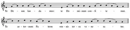 - Ладовая «нерегулярность» мелодии Te Deum была подмечена с давних пор, например, см. в учебнике по григорианике А. де Лафажа «Cours complet de plain-chant» (Paris, 1855, p. 127).