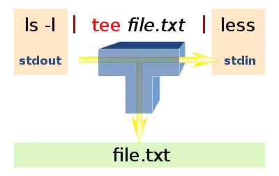 tee используется для разделения выводимых программой данных, таким образом данные могут быть использованы для вывода на дисплей и сохранены в файл. Также команда может быть использована для получения промежуточных данных до того, как они будут изменены другой программой или командой. Команда tee считывает стандартный ввод (stdin), после чего записывает его в стандартный вывод (stdout) и одновременно копирует его в подготовленный файл или переменную. Синтаксис различается в соответствии с местом использования команды.